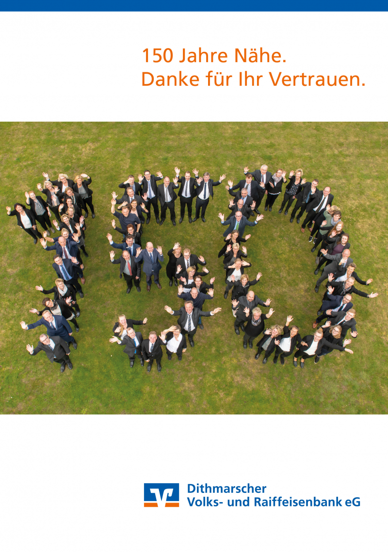 Die Dithmarscher Volks- und Raiffeisenbank wird in diesem Jahr stolze 150 Jahre alt. Wir gratulieren mit Fotoshooting, Angebotsfolder, Beiträgen zum Geschäftsbericht, Plakat, Großflächenplakat und sechsseitiger A4-Beilage. "150 Jahre Nähe – Danke für Ihr Vertrauen" lautet das Motto der Kampagne, und JOC marketing sagt der DVRB "Danke für Ihr Vertrauen".
